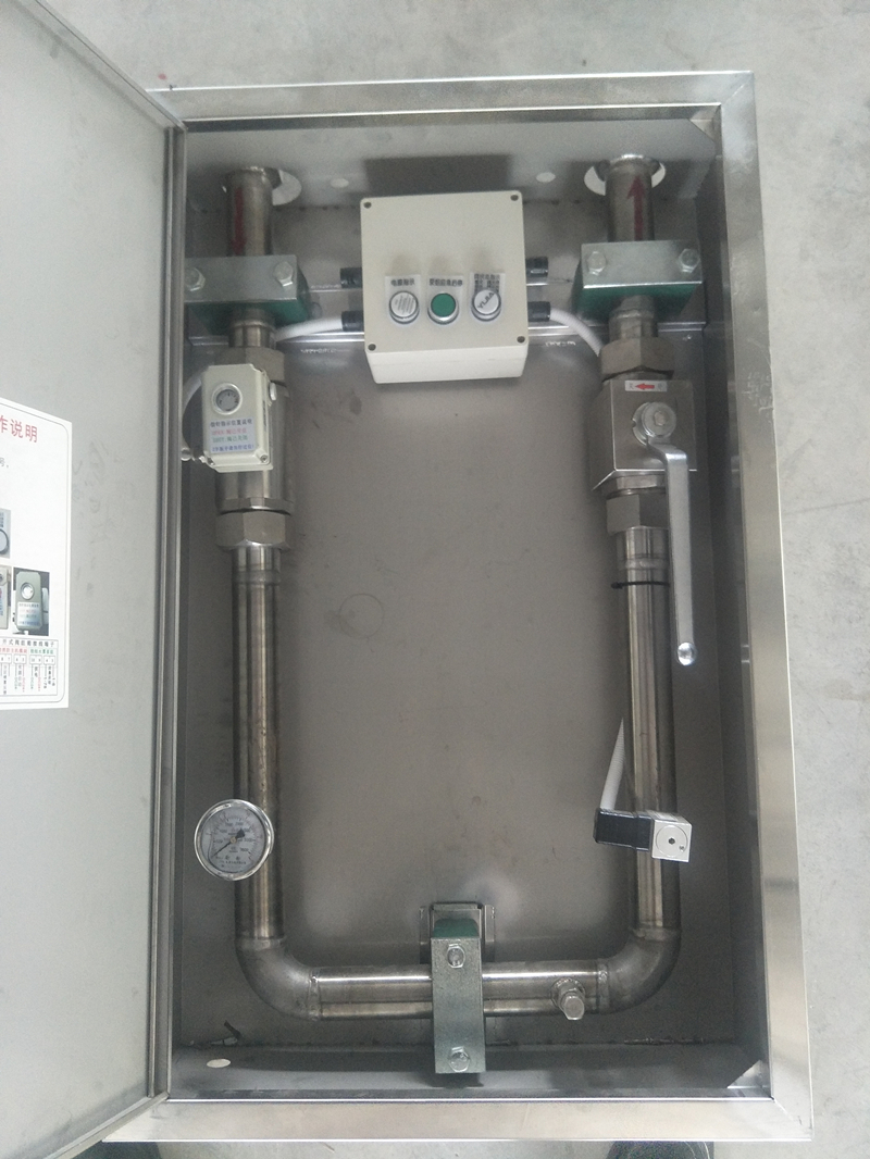 開式分區(qū)控制閥組由電動(dòng)截止閥、手動(dòng)球閥、壓力開關(guān)、壓力表、箱體及連接管件等組成。主要功能是接收火災(zāi)報(bào)警控制器的控制信號后,開啟相應(yīng)分區(qū)的電動(dòng)截止閥向防護(hù)區(qū)釋放細(xì)水霧實(shí)施滅火。在噴頭正常噴放細(xì)水霧時(shí)由壓力開關(guān)向火災(zāi)報(bào)警控制器發(fā)出反饋信號。