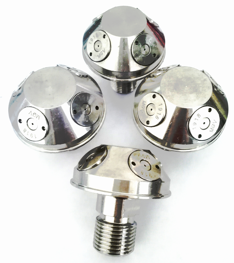 細(xì)水霧噴頭是高壓細(xì)水霧滅火系統(tǒng)的核心部件,分為開式噴頭和閉式噴頭等。噴頭采用奧氏體不銹鋼制造,由殼體、噴嘴等組成,其核心部件是安裝于殼體圓錐面上的多個(gè)離心噴嘴。霧化機(jī)理是在一定水壓下,利用噴嘴內(nèi)旋流件產(chǎn)生的離心力使液體旋轉(zhuǎn),利用離心、撞擊或射流等機(jī)械方式將水霧化。